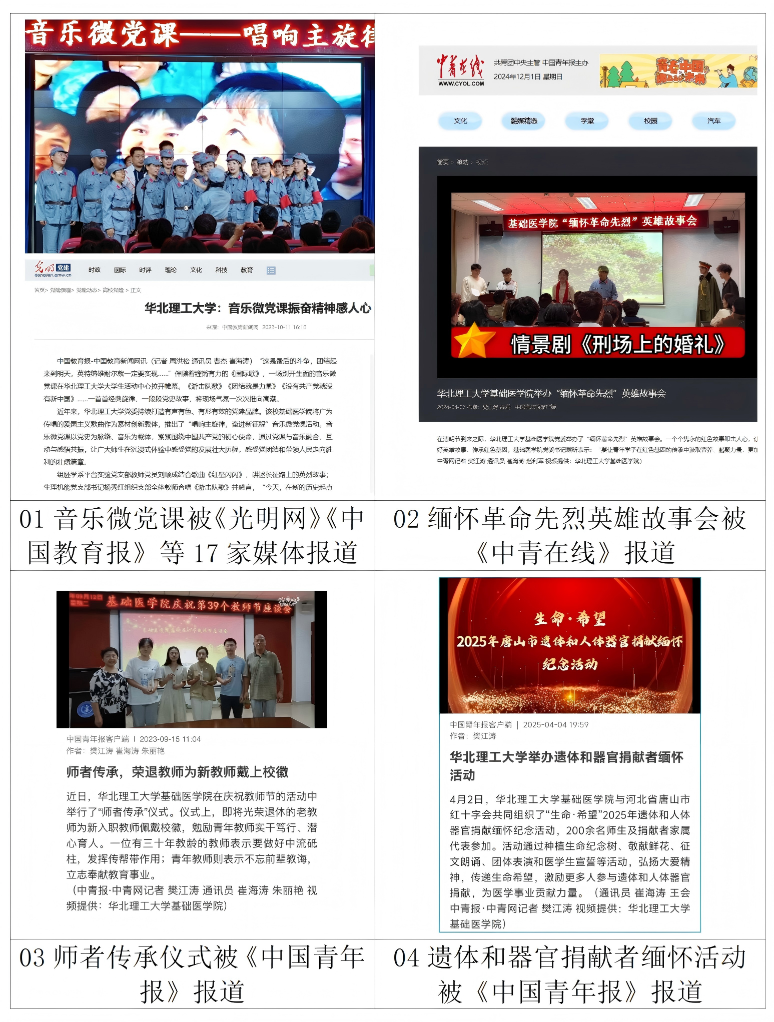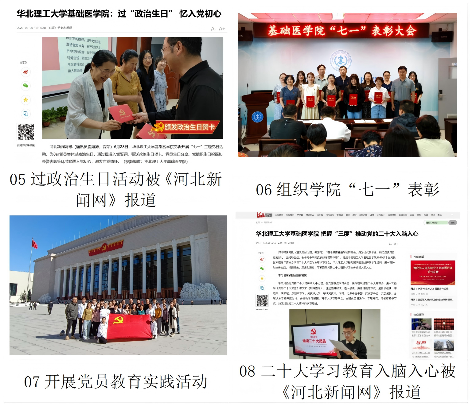 1.强化政治引领,优化思政教育内容。结合重大节日和纪念日等开展专题宣传策划。七一主题视频《重温入党誓词》《过政治生日 忆入党初心》《英雄故事会》被中国青年报河北新闻网报道。教师节主题视频《师者传承,荣退教师为新教师戴上校徽》被中国青年报报道。《基础医学院开展主题党日活动》被河北新闻网、高校之窗报道。将党课宣讲与红歌表演融为一体,举办“唱响主旋律,奋进新征程”音乐微党课活动,被中国教育报、光明网、中国青年报、河北新闻网等16家国家省市媒体报道。