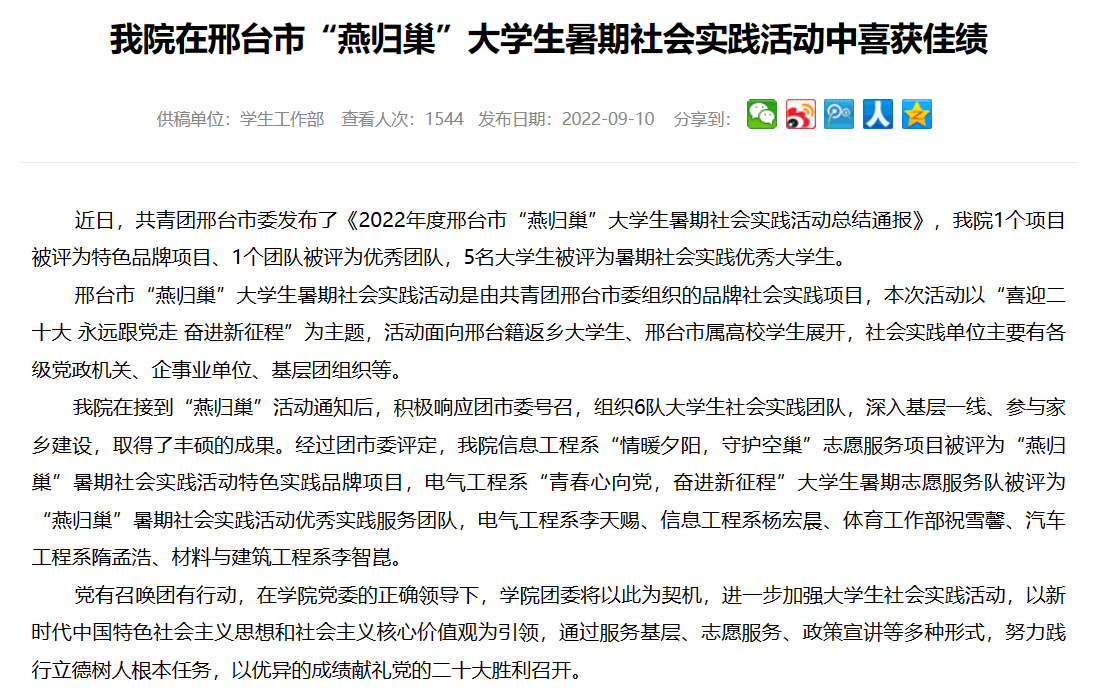 夯实理论根基 打造育人载体。坚持以习近平新时代中国特色社会主义思想为指导,实施党建领航育人工程,筑牢理想信念。从学院党委到各基层党组织,带动全院师生党员,深刻认识“两个确立”的决定性意义,增强“四个意识”、坚定“四个自信”、做到“两个维护”,巩固党建之基。结合专业特色和优势建设“一系部一品牌”,充分发挥基层党组织的战斗堡垒作用和党员干部在教学育人、科研育人、服务育人中的先锋模范作用。学院先后获评河北省双带头人工作室2个,邢台市教育工委先进基层党组织1个,优秀党务工作者2名,优秀共产党员6名;被团市委评为“五四红旗团委”。1人获评河北省优秀党务工作者。